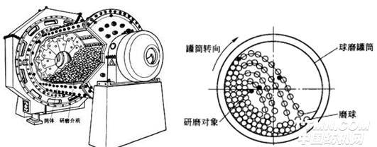 球磨機主要由傳動裝置、筒體裝置、給料裝置、卸料裝置及電氣控制裝置等組成。設備運行時由電氣控制裝置驅動電動機,然后再通過減速機及周邊大此輪的減速傳動,拖動筒體裝置回轉。筒體裝置內部裝有的物料和研磨體在回轉時產生的離心力和摩擦力的作用下,被提升至一定高度后沿近似拋物線的軌跡落下來沖擊和研磨筒體底部的另一部分物料,并產生一定的軸向運行促使物料研磨和混合均勻。研磨完成的物料最后通過卸料裝置排除筒體,以進行下一段工序處理。研磨工藝如下圖1所示。