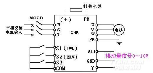 (3)頻率源為模擬量設定(電腦控制板輸出0~10VDC),只需要從AI1口輸入頻率指令;