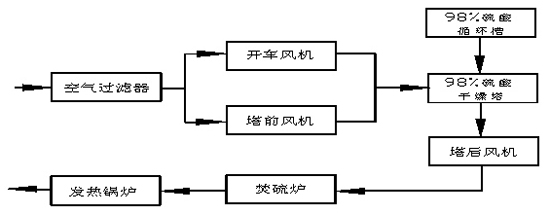 硫磺制酸與礦制酸和冶煉煙氣制酸不同,進入主鼓風機的介質是空氣而不是含二氧化硫氣體,因此有條件將主鼓風機放在干燥塔之前(即風機處于干燥塔上游),從而對硫磺制酸來說,有風機在塔前、塔后之分。