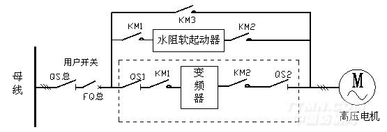 根據現場的額定參數和實際運行工況,再結合我公司的CHH100系列高壓變頻器在其它工程應用情況,我方提供的CHH100變頻器的切換系統采用一拖一自動控制方案,變頻器具有轉速跟蹤功能,其一次系統如下圖所示: