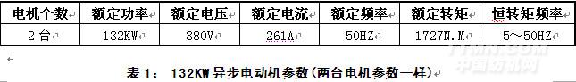 1、客戶提供的電機(jī)參數(shù)見表1。變頻器需控制兩臺132KW異步電機(jī)的同時(shí)啟停控制。給變頻器控制命令有:正轉(zhuǎn)啟動(dòng),反轉(zhuǎn)啟動(dòng),多段速指令,正轉(zhuǎn)點(diǎn)動(dòng),反轉(zhuǎn)點(diǎn)動(dòng),故障復(fù)位;