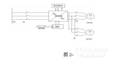變頻器需要一拖二控制兩臺132KW的異步電動(dòng)機(jī)充分考慮其啟動(dòng)時(shí)要求的轉(zhuǎn)矩大,選用GD300-500G-4變頻器。直驅(qū)式壓力機(jī)需快速啟停,正反轉(zhuǎn)快速切換。下壓時(shí)(正轉(zhuǎn))直接啟動(dòng),碰到下壓停止接近開關(guān)后自由停車,靠慣性打擊完部件后(有個(gè)反彈的力)輸出反轉(zhuǎn)信號,上升(反轉(zhuǎn))轉(zhuǎn)速追蹤啟動(dòng),碰到上升停止接近開關(guān)后有效制動(dòng),完成一次打擊動(dòng)作。整個(gè)變頻驅(qū)動(dòng)系統(tǒng)的電氣接線如圖2所示。