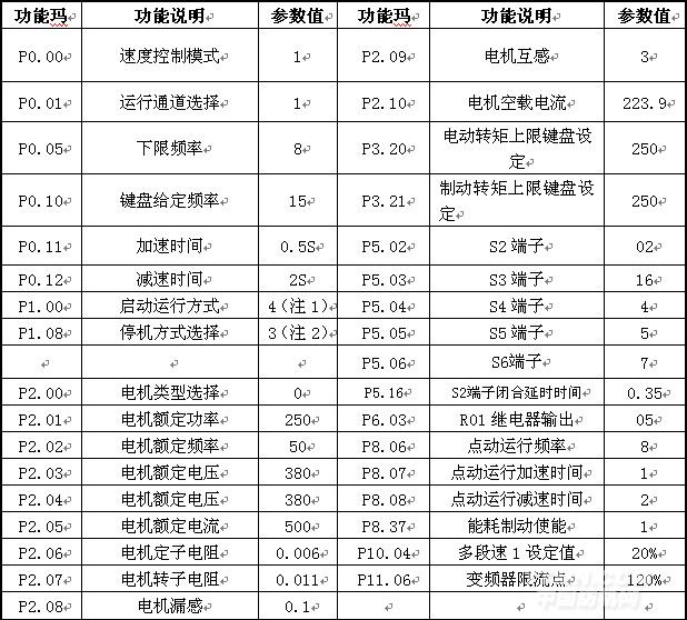 首先將電機(jī)參數(shù)輸入變頻器(功率是兩臺電機(jī)的總和,電流是兩臺電機(jī)的額定電流的總和),輸入后將P00.01改為0,通過P00.15改為2(靜態(tài)自學(xué)習(xí)),學(xué)習(xí)完畢后對參數(shù)表2上所述的參數(shù)一一輸入變頻器內(nèi)。開始空載調(diào)試。
