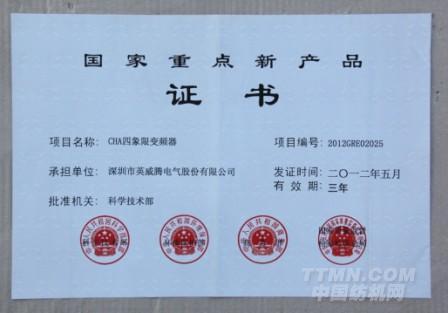 英威騰CHA四象限變頻器榮獲“國家重點新產品”殊榮