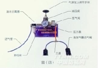機器的兩邊都安裝完之后,氣動組件就可以接到進氣開關的螺紋接頭上,把氣囊管的壓力調到0.1MPa。(先將調壓閥頂部的調節旋鈕逆時針方向轉動卸荷,然后打開氣源,再按順時針方向轉動調節旋鈕,壓力逐漸增加至壓力表指示壓力為所需壓力)。(見圖四)