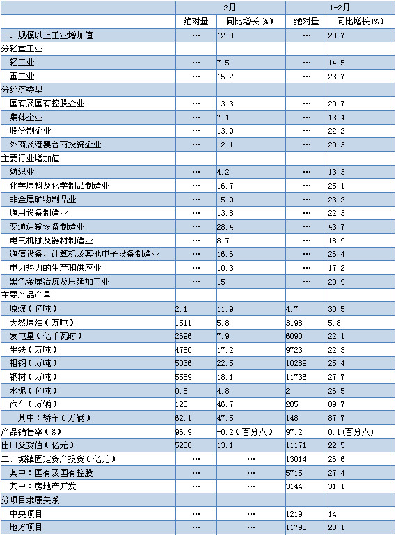 分經濟類型看,1-2月份,國有及國有控股企業增長20.7%,集體企業增長13.4%,股份制企業增長22.2%,外商及港澳臺投資企業增長20.3%。分輕重工業看,1-2月份,重工業增長23.7%,輕工業增長14.5%。