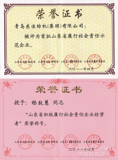 為倡導企業積極承擔和履行社會責任,發揮先進示范作用,促進企業與社會、環境的全面協調可持續發展,山東省企業聯合會、山東省企業家協會、山東省工業經濟聯合會、山東省質量管理協會聯合在全省企業中開展了創建 “山東省首批履行社會責任示范企業”工作,省政府日前隆重召開大會進行表彰,我公司榮登被表彰企業之首,公司被授予“山東省首批履行社會責任示范企業”,公司董事長楊效慧被授予“山東省積極履行社會責任經營者”稱號。