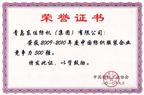 日前,中國紡織工業(yè)協(xié)會在浙江省海寧市勝利閉幕的2009-2010年度中國紡織服裝企業(yè)競爭力500強發(fā)布會上,公布了“2009-2010年度中國紡織服裝企業(yè)競爭力500強”。 青島東佳紡機(集團)有限公司以其良好的經營業(yè)績名列其中。