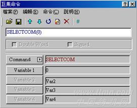 (1)SELECTCOM。SELECTCOM →經(jīng)由此項(xiàng)指令,來選定要切換哪一個(gè)通訊端口,因此只要使用此項(xiàng)指令,再于編輯時(shí)選擇PLC 為NULL的選項(xiàng),就可以使用兩個(gè)通訊端口了,而0代表COM1,1代表COM2。(切換后,所有的通訊指令將自動(dòng)針對所切換的通訊端口作處理,不同的宏之間的切換并不會互相支持或是干擾),參見圖1。