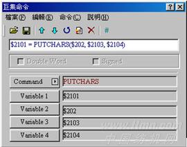 PUTCHARS → 經(jīng)由通訊端口,輸出字符。V1為通訊后回傳的值,可經(jīng)由此值,得到這次通訊的結(jié)果,V2為傳輸數(shù)據(jù)的起始地址,V3為數(shù)據(jù)的長度,V4為所允許的最大通訊時(shí)間,其單位為千分之一秒,參見圖10。
