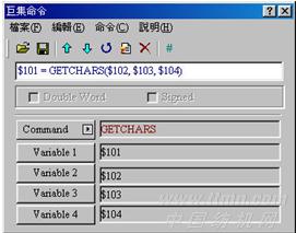 (9)GETCHARS。GETCHARS →經(jīng)由通訊端口得到字符。V1為通訊后回傳的值可經(jīng)由此值,得到這次通訊的結(jié)果,V2為傳輸數(shù)據(jù)的起始地址,V3為數(shù)據(jù)的長度,V4為所允許的最大通訊時(shí)間,其單位為千分之一秒,參見圖11。