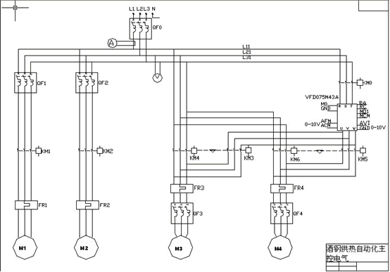 超過水泵的額定供水量時(shí),水泵自動(dòng)轉(zhuǎn)為工頻運(yùn)行,同時(shí)自動(dòng)變頻啟動(dòng)另一臺(tái)水泵運(yùn)行,共同向系統(tǒng)供水。若用水量又趨于下降到單臺(tái)水泵的額定供水量時(shí),原工頻運(yùn)行的水泵停止工作,變頻工作的水泵在新的頻率下單獨(dú)向系統(tǒng)供水。如果系統(tǒng)主泵數(shù)小于2臺(tái),則此過程依次輪換。當(dāng)變頻器控制的電機(jī)滿足不了設(shè)定流量要求,此時(shí)變頻器輸出頻率逐漸上升,直到工作在設(shè)定的上限頻率,如壓力仍達(dá)不到設(shè)定值,由可編程控制器,通過PID運(yùn)算得到輸出量給發(fā)出速度控制指令。如系統(tǒng)用水量超過水泵的額定供水量時(shí),水泵自動(dòng)轉(zhuǎn)為工頻運(yùn)行,同時(shí)自動(dòng)變頻啟動(dòng)另一臺(tái)水泵運(yùn)行,共同向系統(tǒng)供水。若用水量又趨于下降到單臺(tái)水泵的額定供水量時(shí),原工頻運(yùn)行的水泵停止工作,變頻工作的水泵在新的頻率下單獨(dú)向系統(tǒng)供水。如果系統(tǒng)主泵數(shù)小于2臺(tái),則此過程依次輪換。
