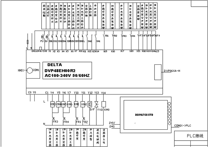 人機(jī)界面選取臺(tái)達(dá)7.5”彩色觸摸屏。人機(jī)界面(HMI)可顯示工藝流程、工藝參數(shù)和設(shè)備狀態(tài),HMI圖形接口友好,只需直接對(duì)圖示進(jìn)行手動(dòng)點(diǎn)觸操作,因此操作簡(jiǎn)便靈活。