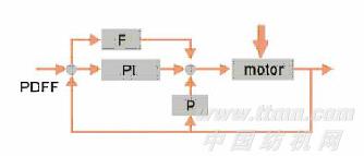 (3)PDFF( Pseudo-Derivative Feedback and Feedforward)強健式控制架構相應更快速、對外部干擾有更強的抑制補償能力,從而能夠保證車刀切削瞬間,或者其它外力突然介入時,伺服定位或定速被影響很少,如圖5所示。