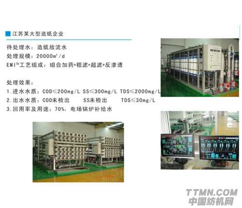 四大技術中與紡織企業密切相關的為膜分離環保集成技術(EMITM技術)。EMITM技術包含前級處理、膜分離、濃縮水處理三級子系統。針對不同行業、不同類型、不同水質、結合業主要求,運用開創開發工程應用經驗及最新實用專利技術的組合,實現投資(投資和運行成本)最大效益化運行模式,并達到節能減排(或零排放)的社會效益。