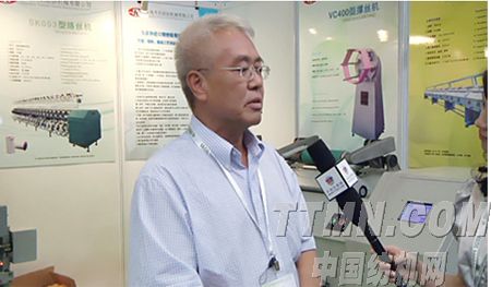 (圖一:中國(guó)紡機(jī)網(wǎng)記者采訪(fǎng)天佑紡機(jī)董事長(zhǎng) 段肇祥)