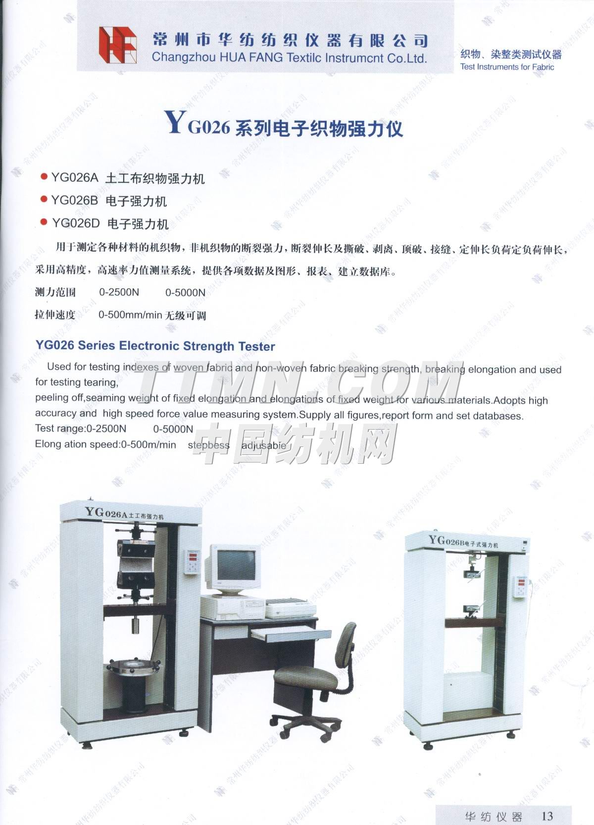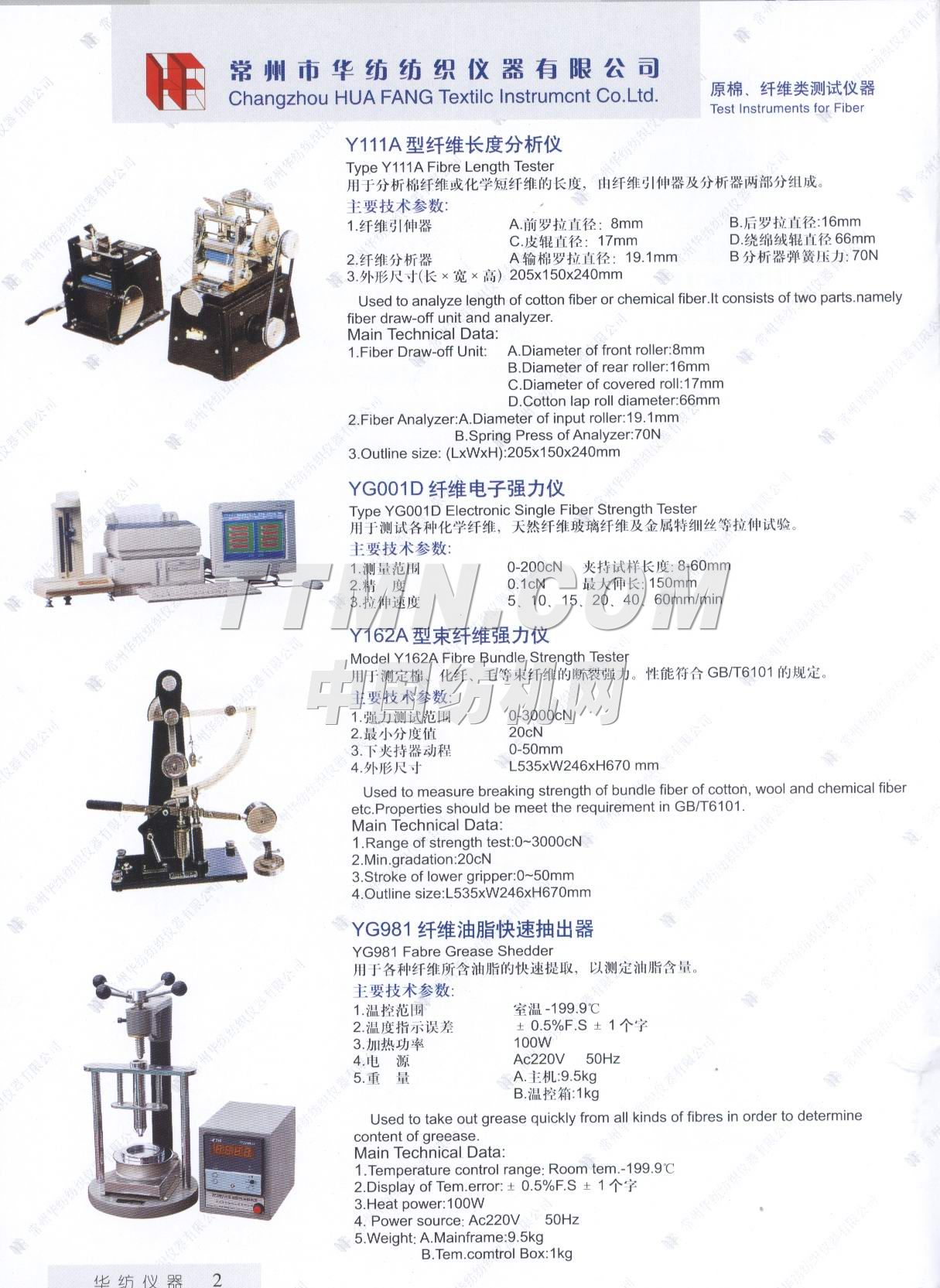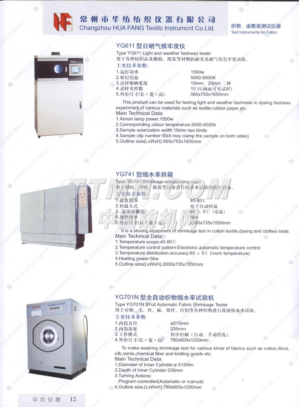 常州市華紡紡織儀器有限公司。它是生產與銷售紡織儀器的專業廠家。主要產品有Y802N、Y101D、YG747系列恒溫烤箱,YG021(A、B、D)、YG026D、YG008D、YG001D等系列電子式強力機,YG321、Y145C、Y331A、YG982等系列纖維紗線、印染的專業測試儀器。產品質量穩定,可靠,所測數據能自動顯示,并打印輸出。公司宗旨: ● 產品更精致, ● 服務更周到, ● 做更好的產品,滿足您的要求。 ...
