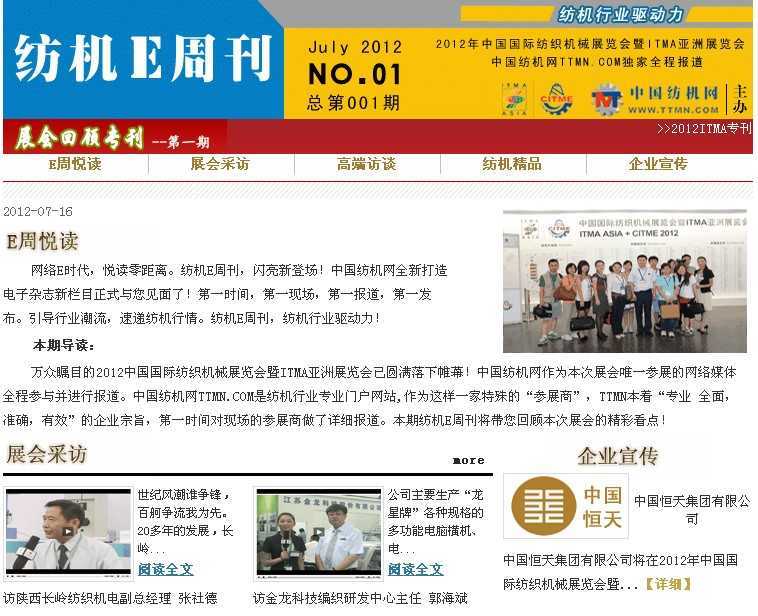 (1)綜合期刊——最新的企業(yè)新產(chǎn)品、報(bào)道紡機(jī)行業(yè)最新動(dòng)態(tài),包括企業(yè)新聞、新產(chǎn)品展示、多媒體采訪報(bào)道等內(nèi)容,涉及范圍廣、涵蓋信息全、可讀性強(qiáng)