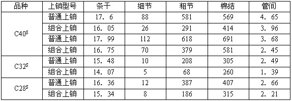 這一款組合上銷是在SX6833金屬上銷基礎上加裝組合鉗口活動片,加長上銷的鉗口面,達到控制細紗前區(qū)浮游纖維,增加其紗條的摩擦力界,縮短浮游區(qū)長度,達到再次牽伸,以降低條干CV%值,減少粗細節(jié),解開由于纖維在運動中的摩擦、纏繞而產(chǎn)生的棉結,達到提高成紗質量,減少紗次疵的目的。該上銷在紡C40S、C32S、C28S紗支,特別是低配棉品種效果尤為明顯,通過長期的紡紗實踐,在其條干細節(jié)、粗節(jié)、棉結各項指標有大幅度提高,收到較好效果,其數(shù)據(jù)見下表: