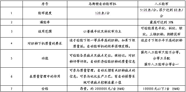 烏斯特驗布系統(tǒng)與人工驗布從目前生產(chǎn)實踐上看各有優(yōu)缺點(見表1),但從發(fā)展的眼光看,烏斯特自動驗布機(jī)將逐步隨著時間發(fā)展,顯示出更多的優(yōu)勢。