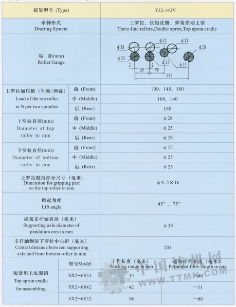 YJ2一142V搖架足三羅拉雙皮圈V型牽伸型式細紗機的一種牽伸加壓裝置,對粗紗進行進一步的牽伸。可對纖維長度在60毫米以下的各種棉纖維化學(xué)纖維進行純紡和混紡。