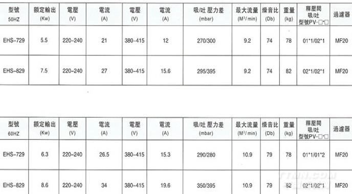 EHS729/829 離心式高壓鼓風機特點:壓力高 風量大 無油氣 免保養 壽命長 低震動,高風壓 體積小,重量輕 低噪音,新設計規格:三相交流電50HZ/60HZ 最大風量:5.2立方米/6.2立方米功率:2200W/2600W 電壓:200-240V/220-240V 346-415V/380-480V 電流:6.7A/10.6A 5.6A/6.1A