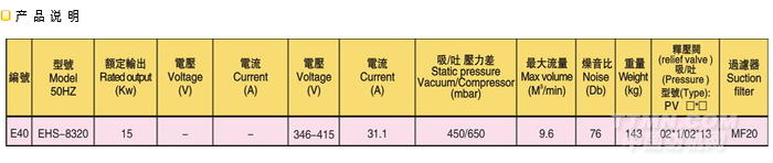 雙段鼓風(fēng)機EHS8320風(fēng)機特點:1.超靜音型,無噪音: 采用德國先進(jìn)技術(shù),馬達(dá)直接運轉(zhuǎn),在通過加上一體式的銷音設(shè)施,改進(jìn)了高壓風(fēng)機噪音大的現(xiàn)像,從而達(dá)到靜音的效果。 2.可靠性高當(dāng)使用情況變化時,機器仍可安全運轉(zhuǎn)。除了葉輪之外,高壓鼓風(fēng)機沒有其他動作,因此可靠性之高幾乎免維修。使用獨一無二且散熱良好的精密外側(cè)軸承,因此它具有下列優(yōu)點:高壓縮比;軸承運轉(zhuǎn)溫度低;潤滑油脂壽命長;免保養(yǎng)。 3.安裝容易 配備齊全,可隨時安裝與使用,供壓縮空氣或用于抽真空,也可任意安裝于水平或垂直的方向。 4.無油無污染 葉輪旋轉(zhuǎn)時,不與任何部分零件接觸,免潤滑,因此可保證百分之百無污染。 5.最高品質(zhì) 經(jīng)過17年的專業(yè)制造經(jīng)驗,最精密機械設(shè)計加上慎重電機配合標(biāo)準(zhǔn)儀器測試,使用所有零件均能達(dá)到最高品質(zhì)要求,運用標(biāo)準(zhǔn)ip54,f級馬達(dá)效率高,故障極少,馬達(dá)與鼓風(fēng)機之間有軸封分試,預(yù)防異物進(jìn)入。同時為確保功能效果,每一臺鼓風(fēng)機在出廠前均經(jīng)過嚴(yán)格測試。 6.電壓:萬國電壓型,50HZ 60HZ均可用,無論您的產(chǎn)品是出口至歐美的使用60Hz,高電壓的國家,還是中東,非洲等使用50Hz電壓的國家及地區(qū),此款環(huán)保風(fēng)機均能達(dá)到要求,功能產(chǎn)齊全,讓您無后顧之憂! 適用范圍:環(huán)保工程 產(chǎn)業(yè)機械,塑膠機械(除濕干燥機),印刷機械(絲網(wǎng)印機),照相制版,pcb設(shè)備,電器設(shè)備,醫(yī)療設(shè)備,各式燃燒機,鍋,環(huán)保養(yǎng)殖業(yè)等等