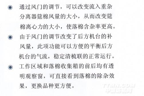 3、在U型彎道底部沒有每根單獨調節角度的塵棒,可適應各種含雜筵棉的工藝需要