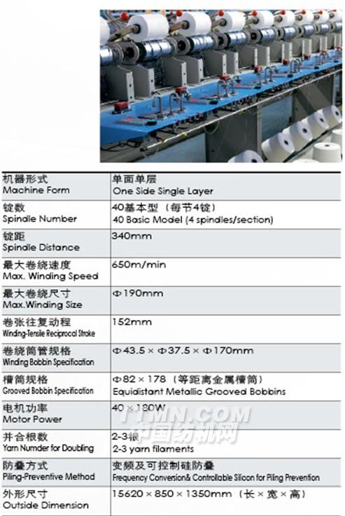 對各種短纖、長纖維的單紗并合,集速性能良好,張力均勻,后道工序對接穩定;槽筒成形,穩定可靠,適用于多品種;電子斷頭檢測與電子定長裝置為一體,既杜絕了單紗及雙股加絲的混入,又可得到長度統一的紗線筒子,使產品質量更高;過絲采用直線紗道,避免了在并紗過程中張力變化;合理清晰的導絲結構,極高的車速,最低的能耗與噪音,使操作更具有優越性。