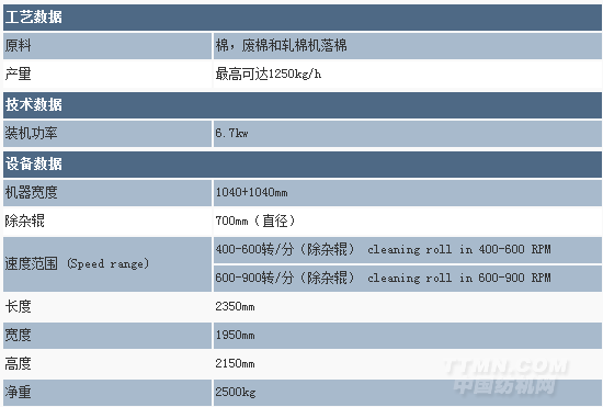 ●加工1種配棉成分且抓棉小車的工作寬度是2250mm時,最高產(chǎn)量為1600kg/h。