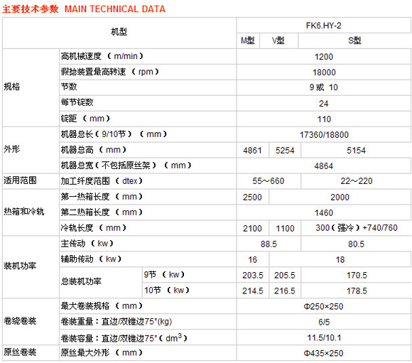 FK6.HY-2型高速彈力絲機主要用于合股絲、無捻絲的生產,也可用于單絲道S捻或Z捻的加工,其A、B兩面均采用獨立的傳動和加熱方式,可分別加工相同或不同的品種,以提高其使用價值,最高機械速度為1200米/分,適紡范圍為滌綸55~660dtex,錦綸22~220dtex。