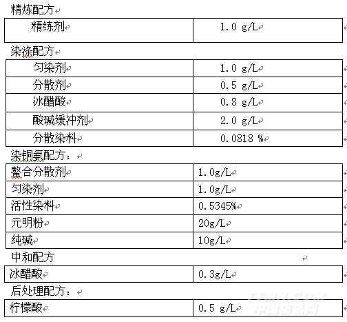 精煉劑,滌綸勻染劑,低聚物分散劑,酸堿緩沖劑,冰醋酸,分散染料,檸檬酸2.4 工藝流程