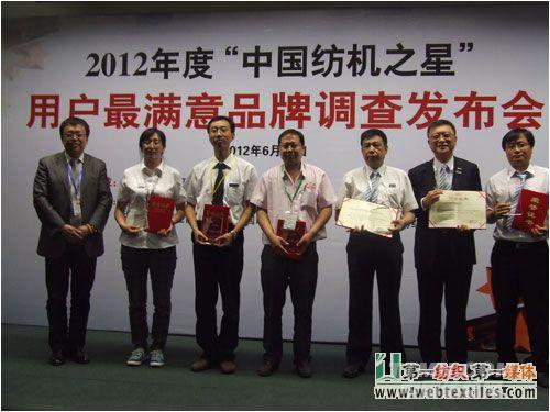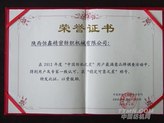 恒鑫紡機公司作為參展商推出的新設備一經亮相,就引起了用戶及業內人士的廣泛關注與認可,充分展示了恒鑫紡機公司科研創新的實力。6月13日,由中國紡織工業協會和中國紡織服裝周刊在國內600多家紡機企業中評選出了2012年度“中國紡機之星”用戶最滿意品牌,24家企業榜上有名。恒鑫紡機公司得到了用戶及專家的一致認可,獲得了“穩定可靠之星”稱號,中國紡織工業協會相關領導為恒鑫紡機公司頒發了榮譽證書和獎杯。