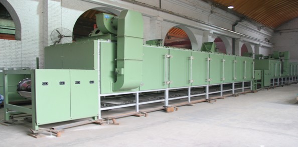 1、產(chǎn)品用途 本機用于粘膠短纖維后處理工序的前區(qū)烘燥,使精煉后經(jīng)濕開棉機開松的粘膠短纖維進行預烘去部分水份,然后經(jīng)喂給再開松后進入后區(qū)烘燥。 本機由進出口機架、烘房機架、勻風板、循環(huán)風機、排氣風機、管路、散熱器、隔熱門、主動傳和鏈板等部件組成。全機烘房共計4節(jié),烘房框架采用積木式組合結(jié)構(gòu)。 2、主要技術參數(shù) 機器型式: 連續(xù)鏈板式 產(chǎn)量: 1萬噸/年(30噸/天) 進機回潮率: 150% 出機回潮率: 80% 機器工作寬度: 1800㎜ 機器工作高度: 1350㎜ 側(cè)封型式: 密封板、密封條 使用蒸汽壓力: 0.5MPa 鏈板速度: 0.7~4.2m/min(無級變速) 烘房組成: 4節(jié) 烘房溫度: 約130℃ 總散熱面積: 860㎡ 溫度控制方式: 鉑熱電阻測溫,氣動薄膜調(diào)節(jié)閥控制溫度調(diào)節(jié) 裝機功率: 約51KW 蒸汽耗量: 約900㎏/h 全機外形尺寸: 12200×3280×3570㎜ 全機重量: 約18噸