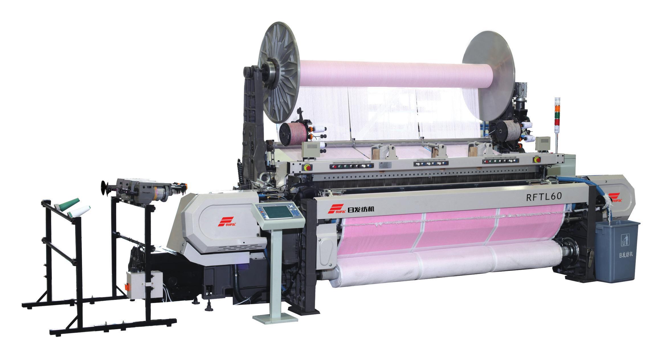 【 產品特點 】 RFTL60型高檔毛巾劍桿織機采用電子送經、電子卷取、筘動式電子起毛圈機構,具有最先進的 電子控制功能,毛圈可由3~7緯任意轉換,并可在運行中自動變緯密,除能織造普通毛圈織物外, 還可織造高低毛、凸凹毛、波浪毛、單面毛等高檔毛圈織物。該機填補了國內高檔毛巾織機領域的空 白,達到國際先進水平。 【 技術參數 】 項目Item主要技術規格Main Technical Parameters 幅寬(cm)Main reed width220、240, 260、290、320 220、240, 260、290、320 轉速Speed (RPM)350-450 350-450 主電機Main Motor7.5KW (變頻器選配) 7.5KW(option :change speed by inverter) 緯密Weft density5-150根/厘米 5-150picks/ cm 電子起圈Electronic loop具備3-7緯自動控制起毛及轉換功能 automatic loop and switching from 3-7 picks 毛圈長度Loop length0-24mm之間任意設定,間隔精度最高可為0.1mm 0-24mm(at will),themaximumdifference accuracy can be up to 0.1mm 電子送經Electronic let-off地經邊盤直徑Ф 8 0 0 m m(毛經邊盤直徑Ф1000mm) G r o u n db e a md i a m e t e rФ 8 0 0 m m (Ф1000mmpilebeam) 電子卷取Electronic take-up最大卷布直徑Ф600mm take-up roll Ф600mm max