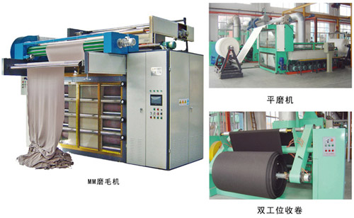 MW、MM系列多輥平磨機,設有6~12支磨輥,采用多輥多次不同砂皮介質對織物表面進行磨削加工,達到表面光澤一致,并具獨特風格的絨面。最新開發的MP立式磨毛機可同時磨削正反兩面,附加氣流除塵,實現雙面磨毛、清除皮粉一次完成,效率比同類設備高3倍以上。
