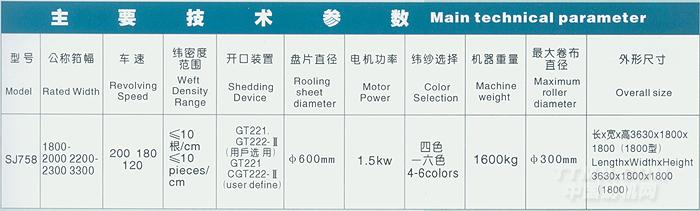 用 途 SJ758 型紙繩編織劍桿織機是在原有機型的基礎上通過技術改進,添加獨特設計,能適用于織造紙繩、尼龍絲、席草等各檔絲繩類型的編織物產品(產品專利號 03255909.7)。 特 點 本機能滿足于編織物產品的織造要求,車速快效率高,性能價格比佳。 該機采用可變程序控制器(PLC)控制,配有自動尋緯裝置,斷緯自停裝置,多色選緯,半自動供油。 具有性能穩定,噪聲小,操作維修方便,外形美觀,適應范圍廣等。