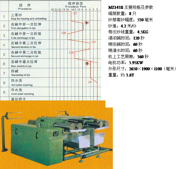 MZ143B型絞紗絲光機(jī),用于棉紗的絲光處理,以增加棉纖維的強(qiáng)力和光澤,提高棉纖維對(duì)染料的親和力