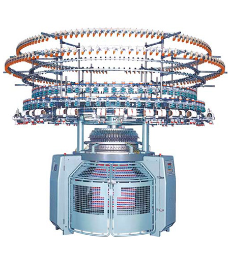 金天梭牌單面電腦自動變色針織機,采用立式調線頭,不易積花絮。