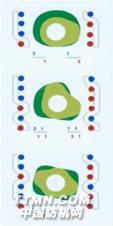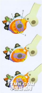 ① 2800型積極旋轉式電子多臂機適合于各類織機,織造各類小花紋織物。每片綜框均由一片寬度等于綜框節距的12mm偏心盤單元(1)進行控制。通過旋轉,安裝在內置軸承上的連桿和偏心裝置把旋轉運動轉化為綜框控制所需的直線運動。偏心盤外側的棘爪(2)將偏心盤與傳動盤(3)相連,實現綜框的提升運動。棘爪(2)的運動是由電子控制系統根據