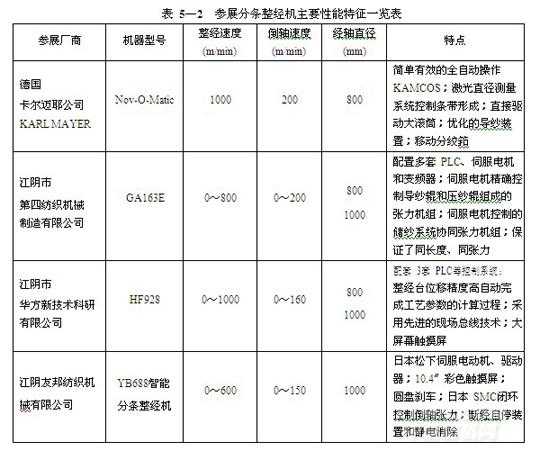 本屆展覽會(huì)實(shí)物參展的分批整經(jīng)機(jī)有江陰四紡機(jī) 和江陰市江陰友邦紡織機(jī)械有限公司 整經(jīng)機(jī)頭各1臺(tái)、沈陽(yáng)紡織機(jī)械廠有限公司 大筒子架1臺(tái)。其他均以樣本的形式展出,產(chǎn)品型號(hào)與上屆基本相同,技術(shù)上變化不大。實(shí)物參展分批整經(jīng)機(jī)的主要技術(shù)參數(shù)及其特點(diǎn)見(jiàn)表 5—1。