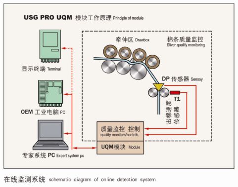 在線檢測功能(選用):本機可選用USTER? SLIVERGUARD PRO/第二代在線棉條質(zhì)量管理系統(tǒng)。該系統(tǒng)可隨機統(tǒng)計1m,3m,10m的重量不勻率,及CV%,A%等,可隨時查看和記錄波譜圖,根據(jù)用戶需要選擇超標自停或者超標報警,并顯示停車原因或報警原因,從而有利于質(zhì)量控制與分析,減少試驗工勞動強度。