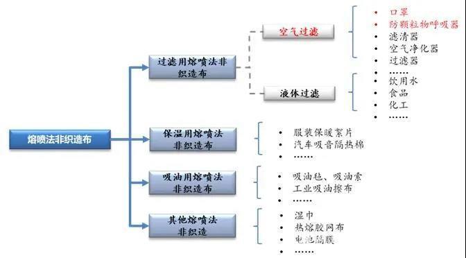 熔噴布在整個紡織品甚至是非織造布體系里來說很小,熔噴布只是紡織行業(yè)非織造布的一個小品類,而口罩用熔噴布更是熔噴布多種用途中的一種。目前熔噴布在過濾、吸油、保暖等多個領(lǐng)域有著廣泛應(yīng)用,僅過濾用的熔噴布就包括口罩用、空氣凈化器用、食品和飲用水等液體過濾用三種,吸油類一般用于吸油氈、吸油索等產(chǎn)品,保溫類主要用于服裝、汽車、保暖絮片等產(chǎn)品。