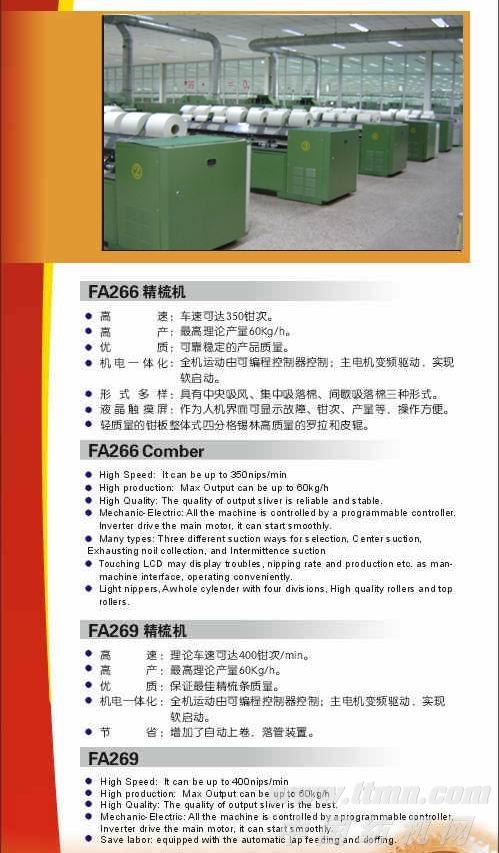| 紡紗機械 開清棉 梳棉機 精梳機 并條機 粗紗機 細紗機 紡紗機 絡并捻 織造機械 劍桿織機 噴氣織機 整經機 漿紗機 提花機 織帶機 化纖機械 化纖成套設備 化纖通用設備 針織機械 圓緯機 橫機 經編機 襪機 手套機 鉤編機 非織造機械 成網機械 非織造布單機設備 非織造布生產線 紡織器材 鋼領 錠子 羅拉 搖架 上銷 錫林 鋼筘 針布 橡膠 染整機械 染色機 印花機 蒸箱 軋車 烘燥機 印染后整理 聯合機 驗布機 紡機自動化 變頻器 傳感器 繼電器 紡織儀器 紡織配件 紡紗配件 無梭織機配件 針織配件 印染配件 |