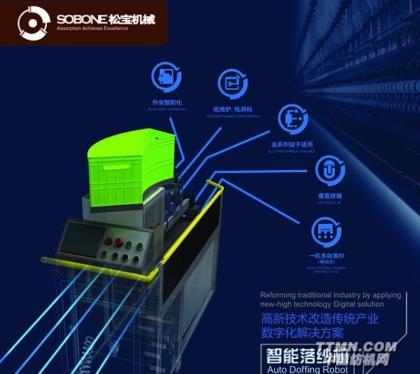 隨著勞動力成本的提高人員緊缺問題的日趨嚴峻,紡機裝備的自動化水平成為業界關注的焦點問題,細紗工序是紡織廠用工最多的車間,目前自動落紗設備只在市場占有率5%的長車上使用,95%的短車自動落紗的改造升級還處于初始的研發階段,安徽銅陵松寶紡機適時推出的環錠紡智能落紗機滿足了市場的需求。