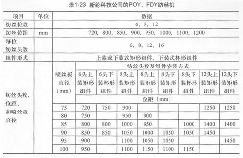 東莞市新綸纖維材料科技有限公司展出POY,FDY紡絲機,其技術規格見表1—23。