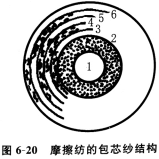 摩擦紡還能紡包芯紗,用長絲或短纖紡制的紗作芯紗,垂直喂入的纖維分層次被搓捻在芯紗上,形成有特色的包芯紗,如圖6—20所示。