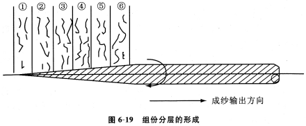 摩擦紡紗過程中,纖維以垂直于成紗輸出方向并沿塵籠楔形凝聚區逐漸添加并捻人錐形紗尾上,使摩擦紗形成從紗芯到外層逐層包覆的分層結構。圖6—19所示為6根條子并排喂入時,成紗在組份成份上形成分層結構的情況。