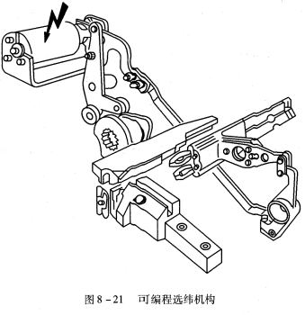 這種選緯機構中,以計算機控制的電磁選緯驅動裝置代替多臂機的綜框連桿,完成選緯動作,圖8—21是電磁控制的二色選緯機構,還有四色選緯機構。織物的色緯變化信號由計算機發出,由電磁運動控制遞緯器座的變換,因色緯循環變化方便,有利于織物品種的變換。