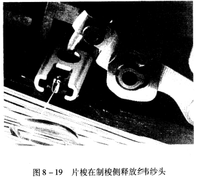 固裝在接梭箱凸輪軸12上的溝槽凸輪11的轉速與主軸相同。擺桿9的下端有一轉子嵌入凸輪的溝槽內,擺桿9通過連桿8使退梭片2做往復運動,將已經靜止的片梭1推向布邊。當片梭被推至布邊處后,邊紗鉗夾住緯紗,此時片梭的鉗口應釋放緯紗,這由梭夾打開器3完成。梭夾打開器3的一端活套在小軸5上,由于吊桿4的上下運動,使梭夾打開器以小軸5為中心上下擺動。當它向下擺動時,梭夾打開器前端的尖嘴便插入梭夾,將緯紗釋放(圖8—19)。吊桿4的運動由一套共軛凸輪機構傳動。T形桿7也由共軛凸輪驅動做往復移動,當T形桿向機后方向移動時,推梭桿6將片梭推到導槽中,再由壓梭器將片梭壓擠到輸送鏈上,運回投梭側。